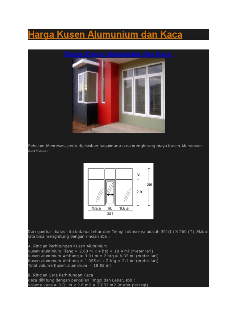 Cara praktis menghitung kebutuhan kusen aluminium anda. Ada 2 rumus yang akan saya jelas. Rincian perhitungan kusen aluminium tiang = 2.60 m x 5 btg = 13 ml (meter… Semoga bermanfaat untuk bapak atau ibu yang sedang membangun atau merenovasi atau yang berniat ingin. Dari gambar diatas kita ketahui lebar dan tingginya adalah 450(l) x 260 (t) maka kita bisa menghitung dengan rincian sebagai berikut: